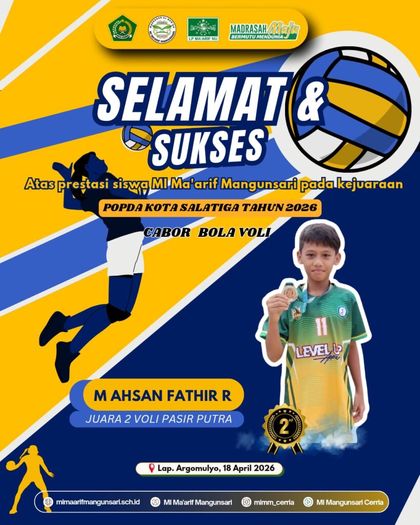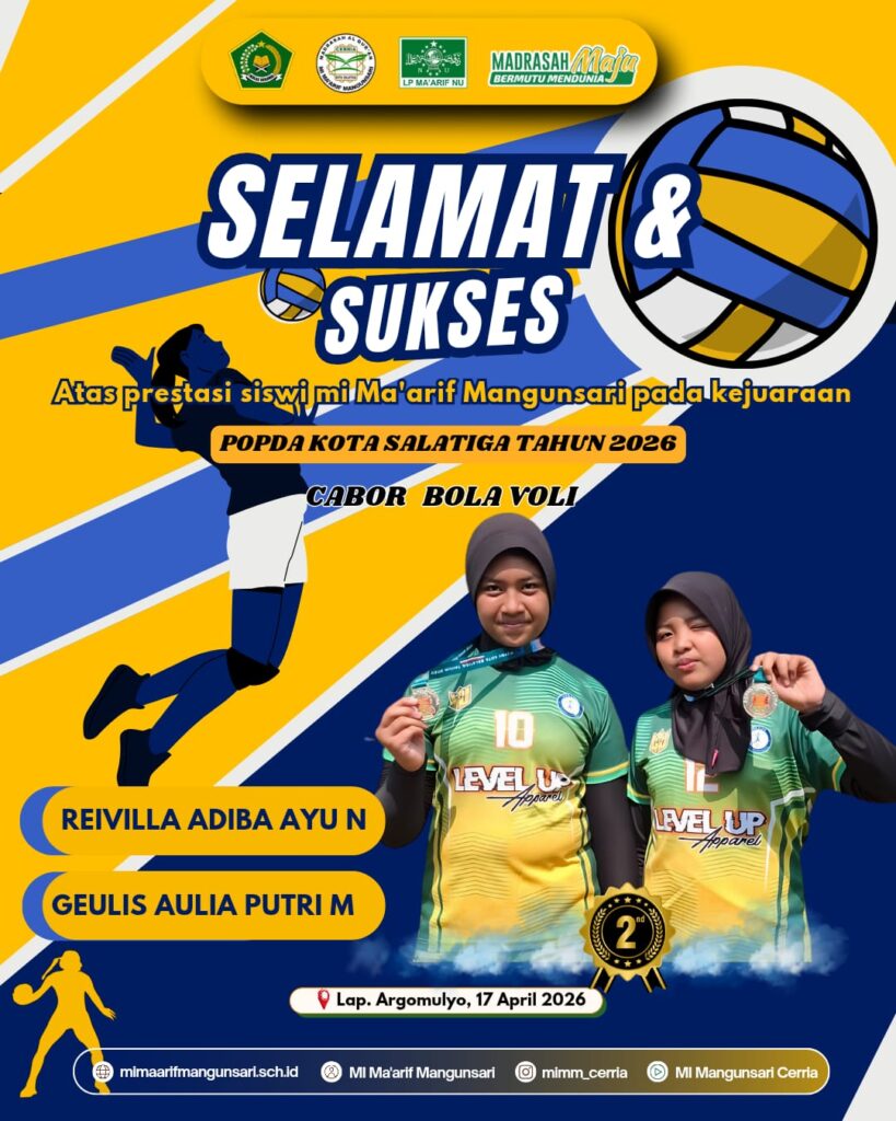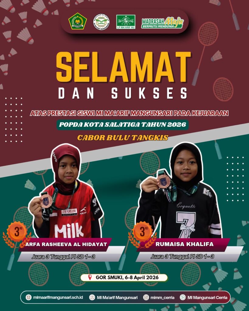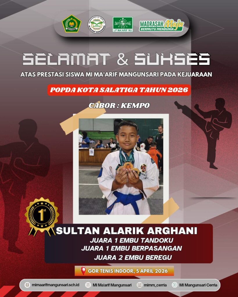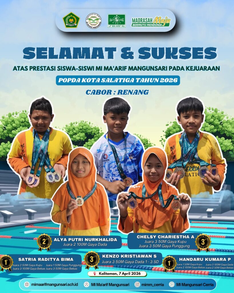 SALATIGA – MI Ma’arif Mangunsari kembali membuktikan posisinya sebagai salah satu lembaga pendidikan dasar unggulan di Kota Salatiga. Melalui kerja sama antara siswa-siswi bersama Bapak / Ibu guru pendamping serta dukungan orang tua. Hal itu mampu meningkatkan jiwa disiplin, percaya diri, resiliensi, dan sportivitas bagi siswa-siswi dalam berkompetisi. Sehingga berhasil memborong sejumlah 34 Medali pada Kejuaraan POPDA Kota Salatiga Tahun 2026 dengan 9 cabang olahraga.