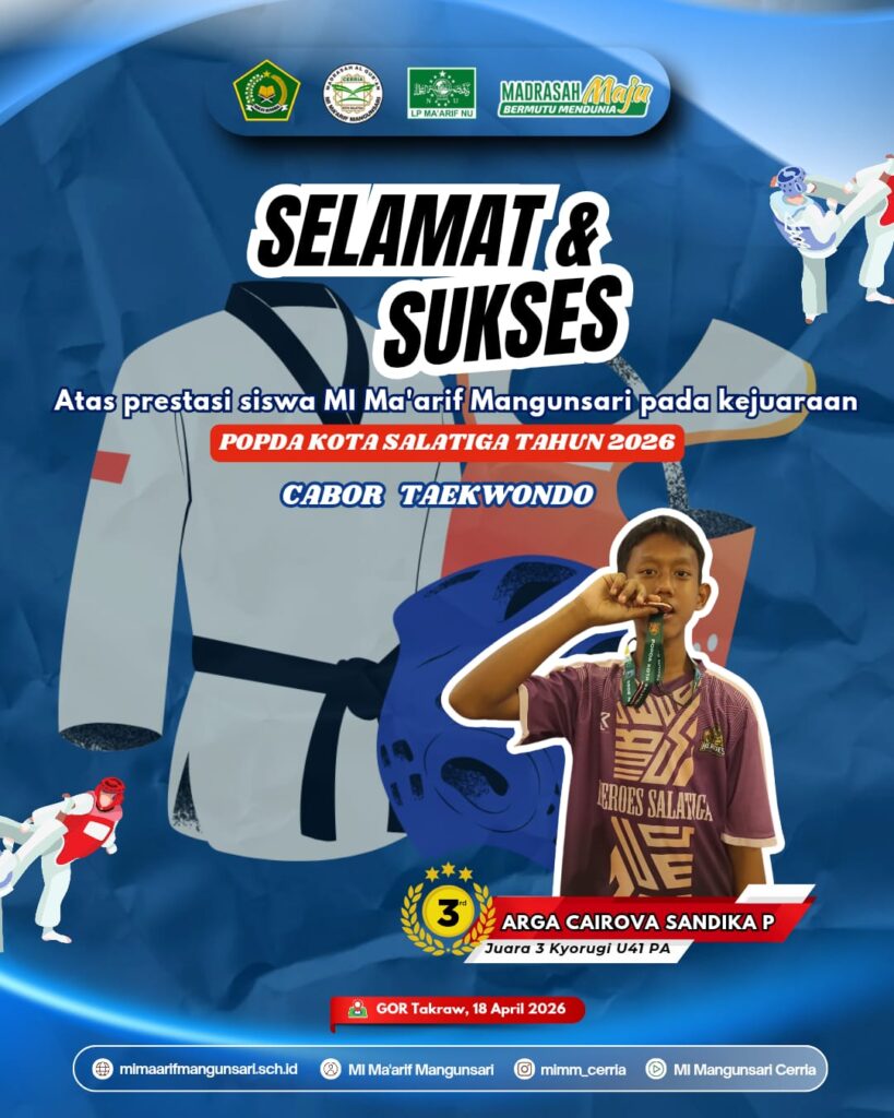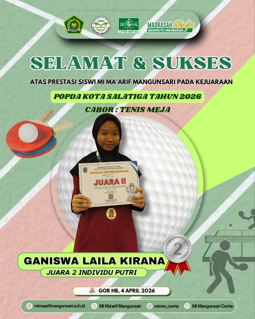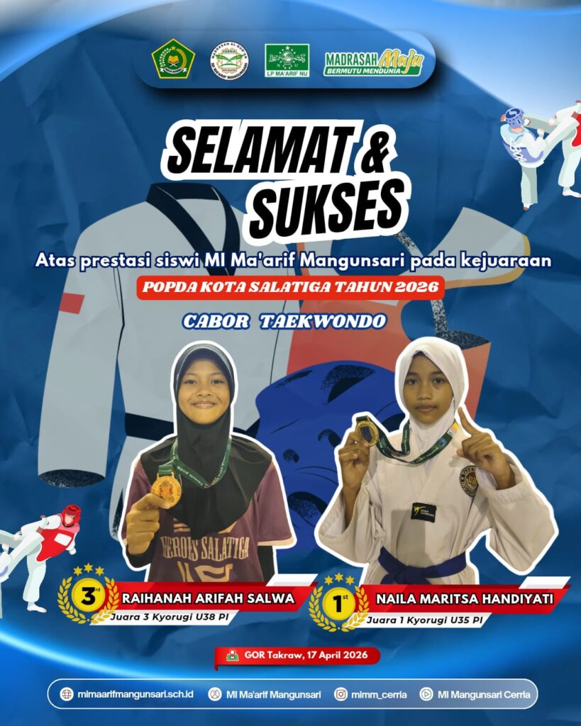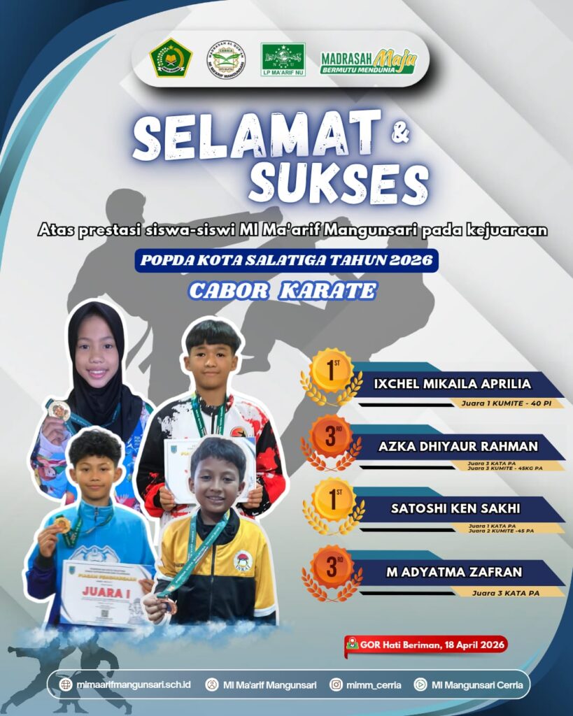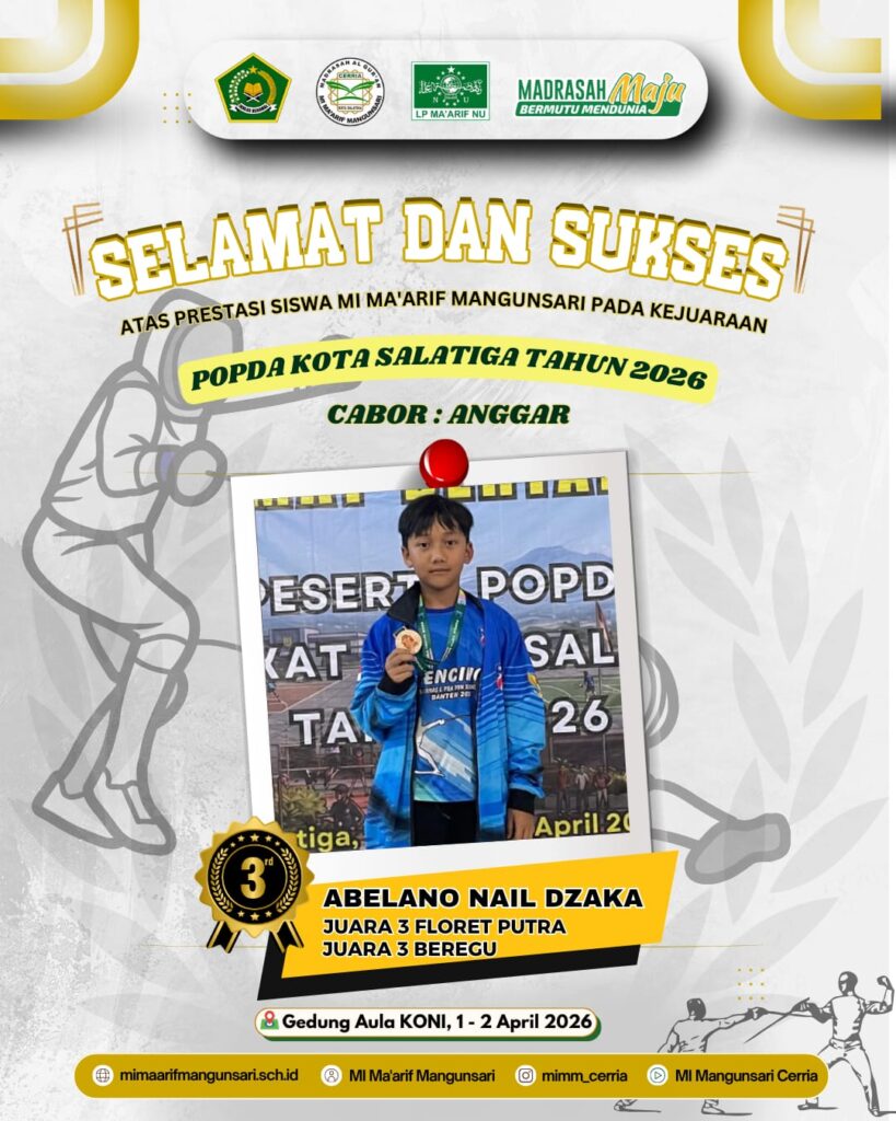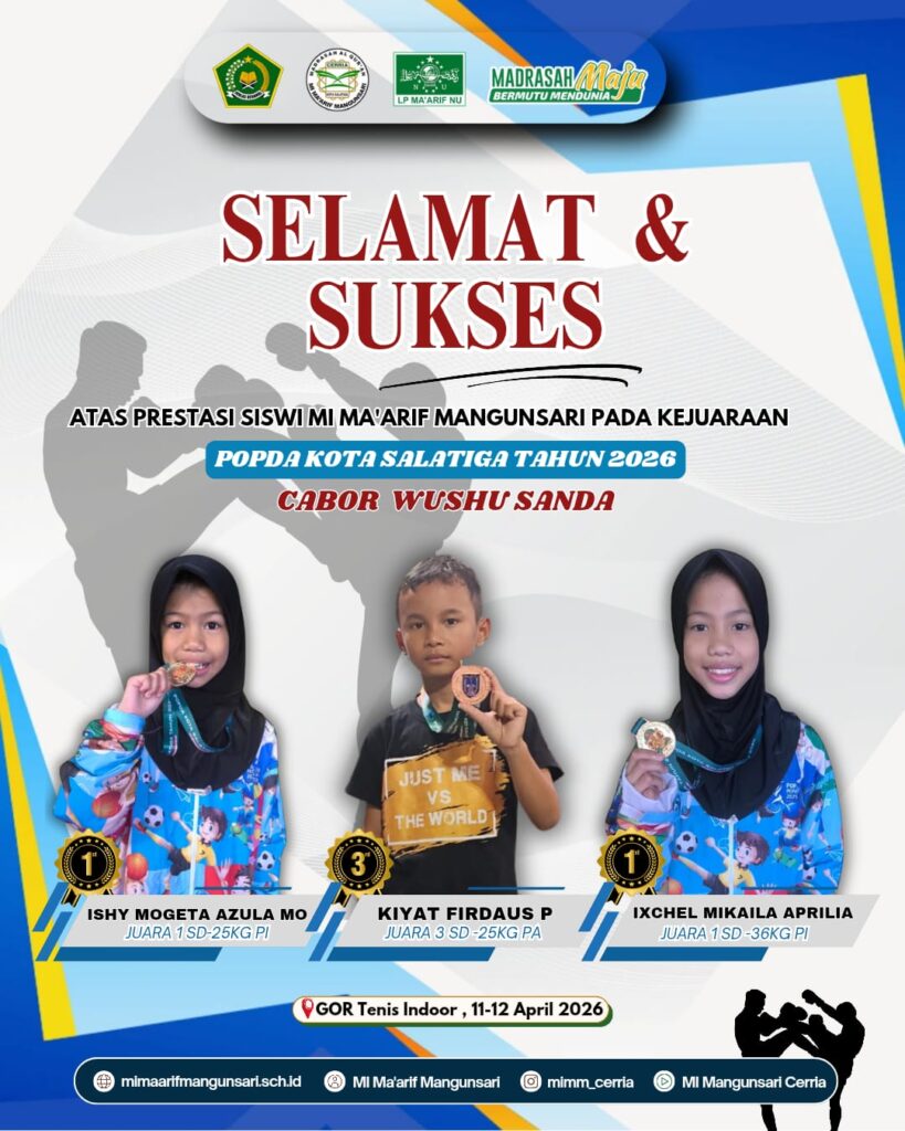 Pekan Olahraga Pelajar Daerah (POPDA) Kota Salatiga merupakan ajang pembuktian prestasi belajar dalam berbagai cabang olahraga. Kompetisi ini diselenggarakan pada 1 April – 19 April 2026 mencakup 18 cabor diantaranya : atletik, kempo, wushu sanda, anggar, bulu tangkis, taekwondo, tenis meja, renang, karate, dll. Perolehan 34 Medali yang diraih terdiri dari 9 Medali Emas, 9 Medali Perak, dan 16 Medali Perunggu dari 9 cabang olahraga diantaranya anggar, kempo, renang, bulu tangkis, bola voli, taekwondo, karate, tenis meja, dan wushu sanda. Berikut hasil capaian siswa-siswi MI Ma’arif Mangunsari :